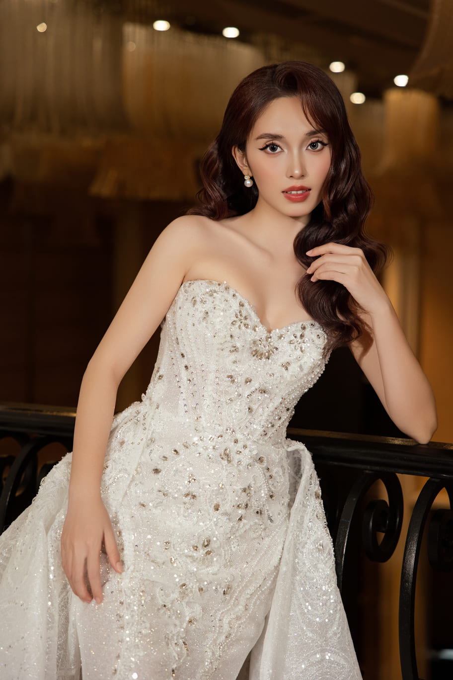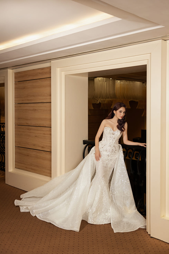 Chiếc váy cưới đuôi cá này mang phong cách lộng lẫy và kiêu sa, với thiết kế cúp ngực quyến rũ và phom váy ôm sát cơ thể. Điểm nổi bật là phần tà dài xòe rộng được may rời (kiểu overskirt), tạo hiệu ứng hoành tráng và đầy ấn tượng khi di chuyển.