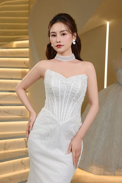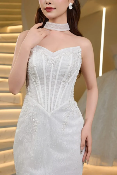 Chiếc váy cưới mang phong cách gợi cảm và quyến rũ với thiết kế cúp ngực trái tim ôm sát cơ thể. Phần thân áo được nhấn bằng chi tiết corset xuyên thấu tinh tế, giúp tôn dáng và tạo hiệu ứng eo thon gọn.