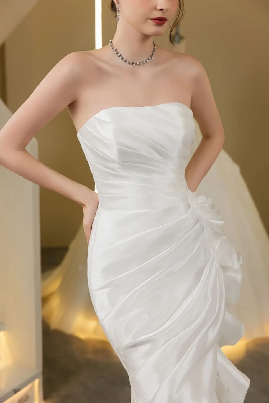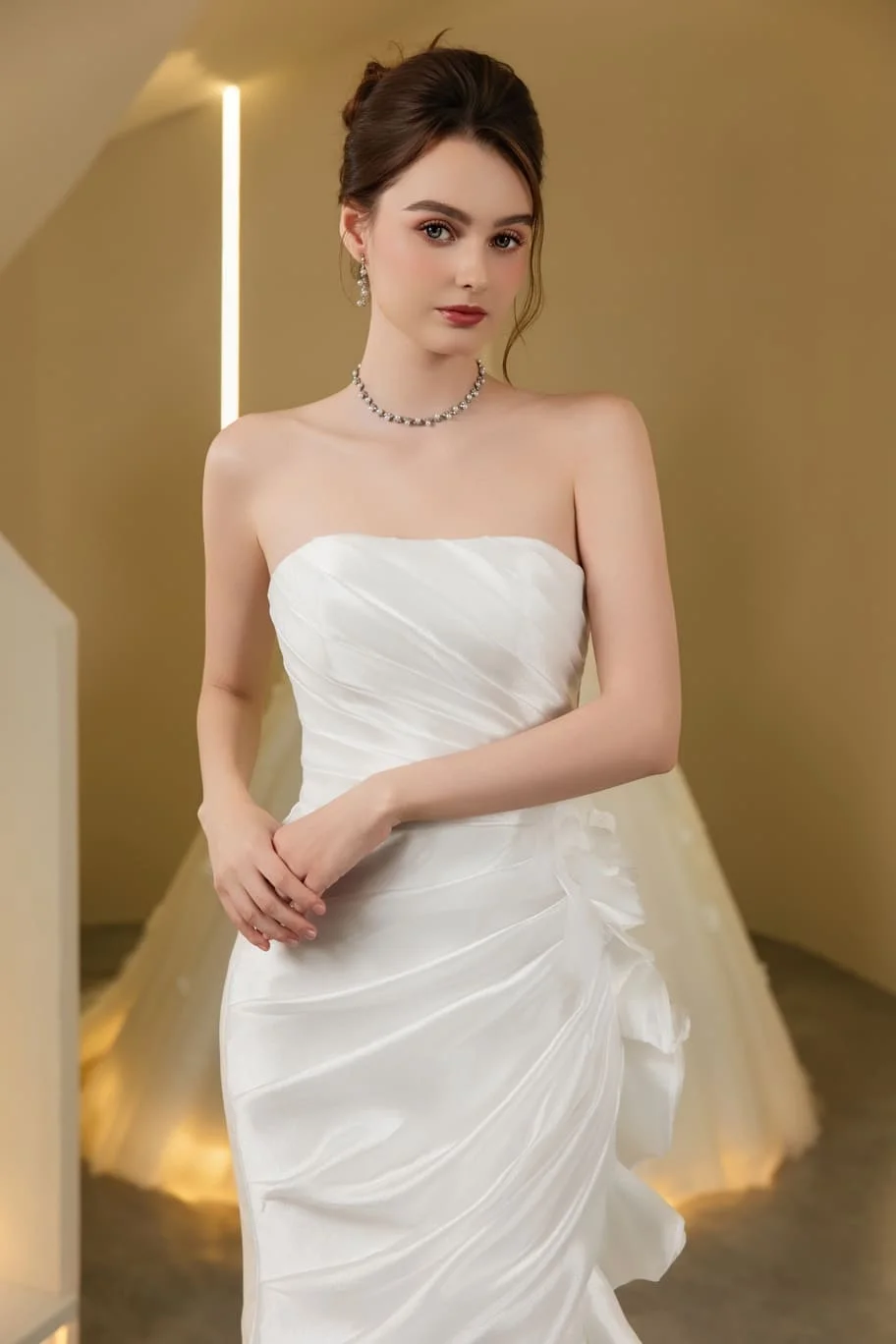 Chiếc váy cưới dáng đuôi cá hiện đại, thiết kế cúp ngực trơn ôm sát, tôn lên đường cong quyến rũ của cô dâu. bChất liệu satin cao cấp được xử lý khéo léo với các nếp gấp xếp ly tinh tế, tạo hiệu ứng bắt sáng nhẹ nhàng và mang lại vẻ ngoài thanh lịch, mềm mại.