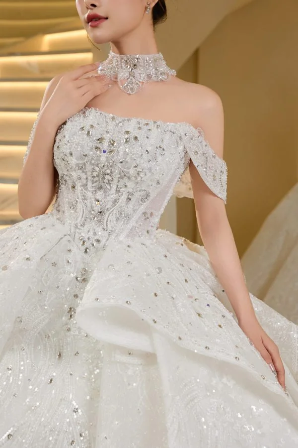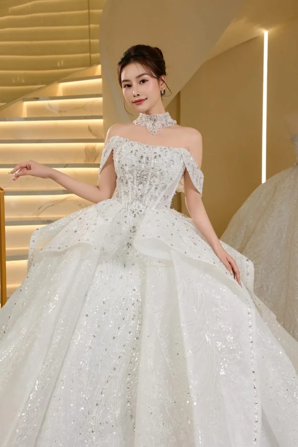 Chiếc váy cưới xoè mang vẻ đẹp lộng lẫy, kiêu sa với thiết kế trễ vai và cổ yếm đính đá sang trọng. Phần corset ôm sát thân trên được đính kết tinh xảo bằng pha lê và cườm nổi bật, tôn lên vòng eo thanh mảnh của cô dâu.