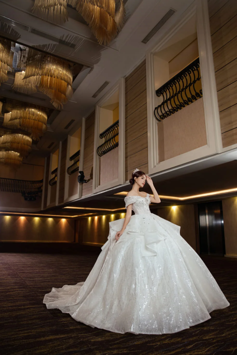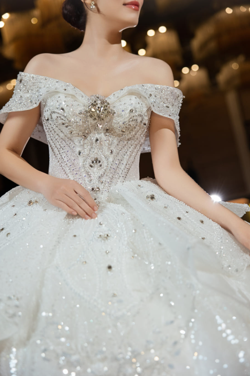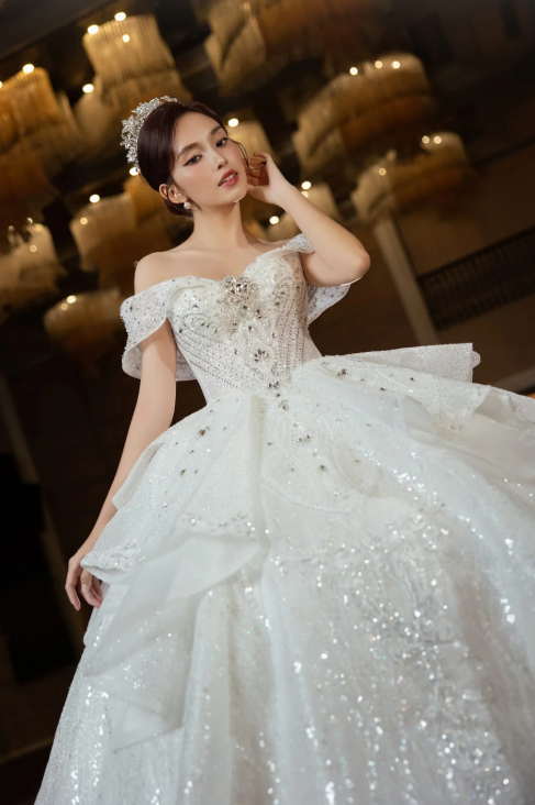 Tầng váy được xếp lớp bay bổng, xen kẽ họa tiết ánh kim giúp chiếc váy thêm phần sang trọng, nổi bật dưới ánh đèn tiệc cưới. Vẻ đẹp tổng thể vừa ngọt ngào, quý phái, vừa hiện đại, rất phù hợp với cô dâu yêu phong cách lấp lánh kiêu sa.