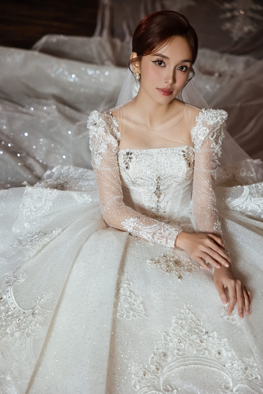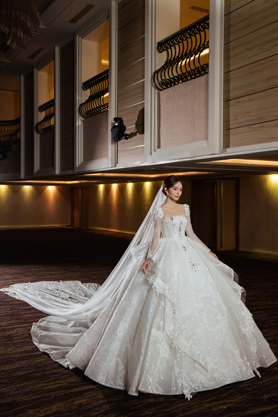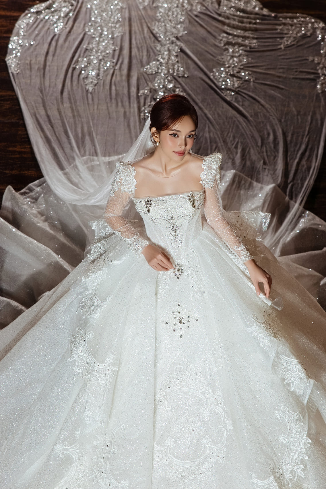 Chiếc váy cưới xòe dáng công chúa này mang vẻ đẹp lộng lẫy, cổ điển và quyền quý. Thiết kế tay dài xuyên thấu đính ren và pha lê tạo cảm giác thanh thoát, sang trọng.