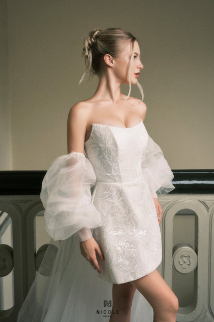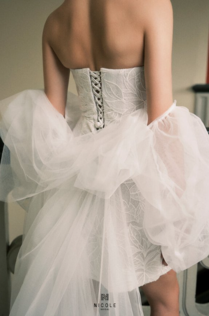 Chiếc váy cưới ngắn dáng quây mang vẻ đẹp tinh khôi và hiện đại, được điểm xuyết họa tiết ren nhẹ nhàng giúp tôn lên đường cong thanh thoát của cô dâu. Phần tay bồng voan mềm tạo cảm giác lãng mạn, đồng thời tăng nét nữ tính đầy cuốn hút.