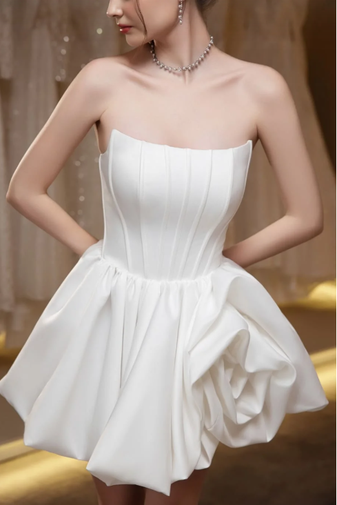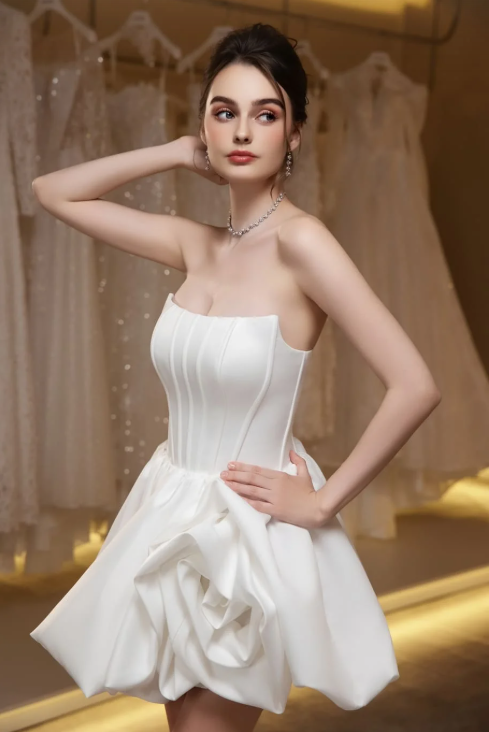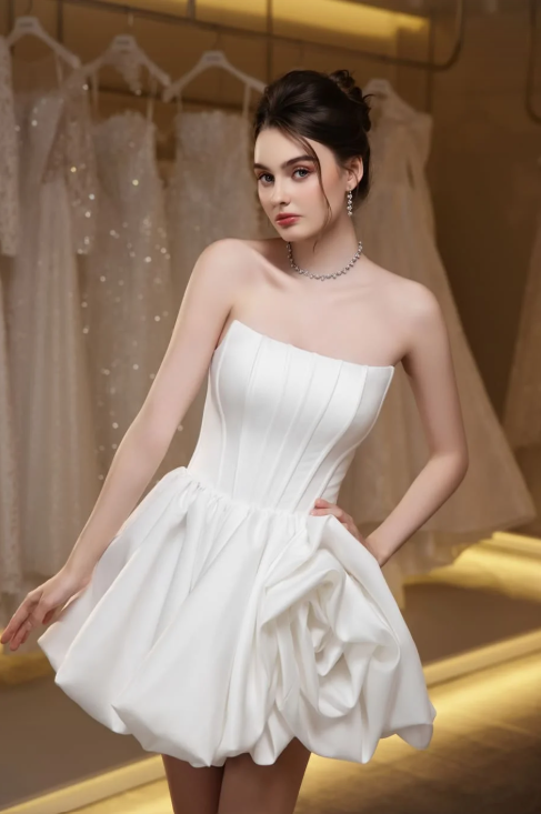 Chiếc váy cưới ngắn dáng quây tối giản mà tinh tế, với phần corset gân nổi giúp tôn lên bờ vai và vòng eo thon gọn. Chân váy tạo phom phồng mềm mại, điểm nhấn hoa xếp nếp lớn bên hông mang lại vẻ thời thượng và cuốn hút.